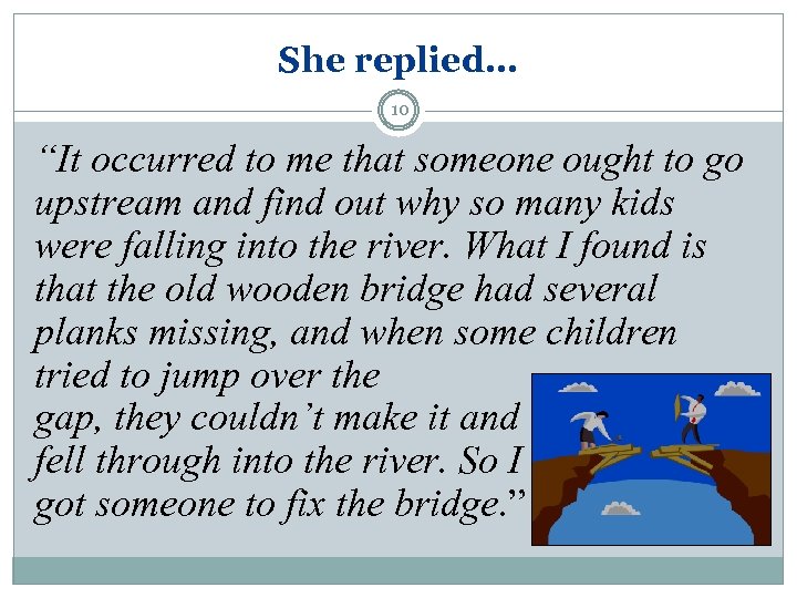 She replied… 10 “It occurred to me that someone ought to go upstream and find out why so many kids were falling into the river. What I found is that the old wooden bridge had several planks missing, and when some children tried to jump over the gap, they couldn’t make it and fell through into the river. So I got someone to fix the bridge. ”