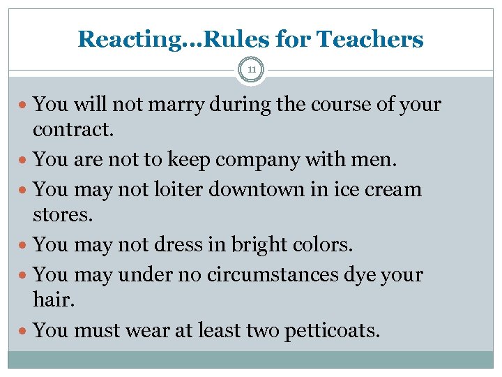 Reacting…Rules for Teachers 11 You will not marry during the course of your contract. You are not to keep company with men. You may not loiter downtown in ice cream stores. You may not dress in bright colors. You may under no circumstances dye your hair. You must wear at least two petticoats.