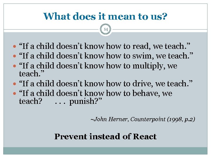 What does it mean to us? 14 “If a child doesn’t know how to read, we teach. ” “If a child doesn’t know how to swim, we teach. ” “If a child doesn’t know how to multiply, we teach. ” “If a child doesn’t know how to drive, we teach. ” “If a child doesn’t know how to behave, we teach? . . . punish? ” ~John Herner, Counterpoint (1998, p. 2) Prevent instead of React
