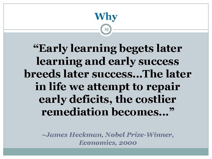 Why 19 “Early learning begets later learning and early success breeds later success…The later in life we attempt to repair early deficits, the costlier remediation becomes…” ~James Heckman, Nobel Prize-Winner, Economics, 2000