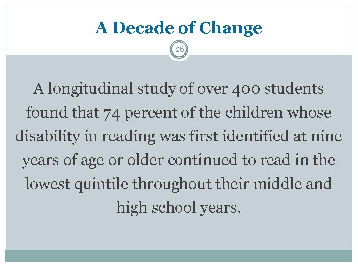 A Decade of Change 26 A longitudinal study of over 400 students found that 74 percent of the children whose disability in reading was first identified at nine years of age or older continued to read in the lowest quintile throughout their middle and high school years.
