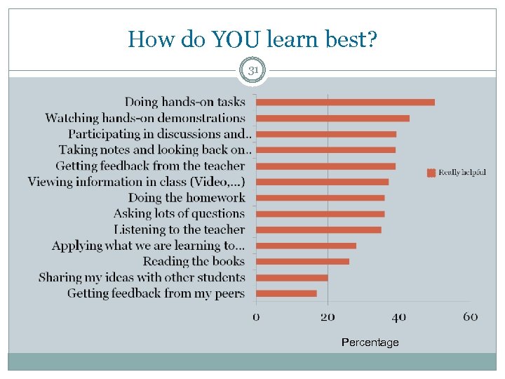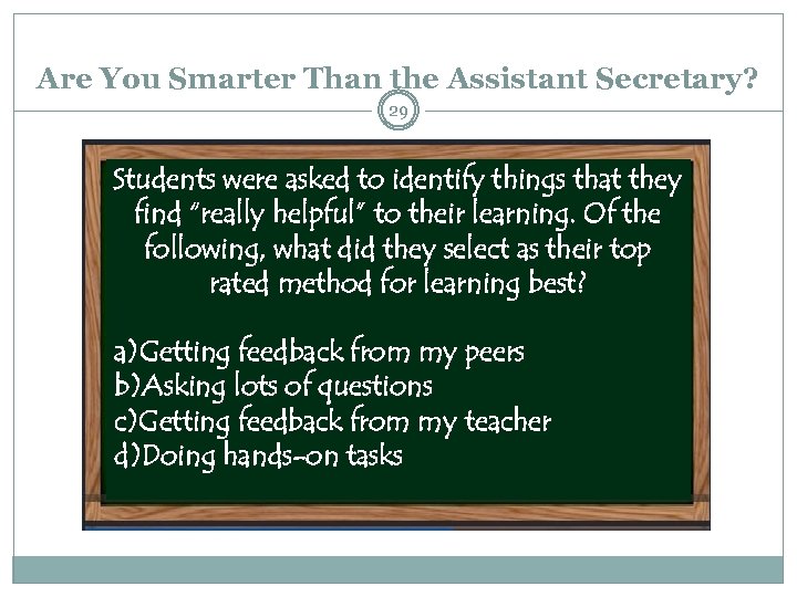 Are You Smarter Than the Assistant Secretary? 29 Students were asked to identify things that they find “really helpful” to their learning. Of the following, what did they select as their top rated method for learning best? a)Getting feedback from my peers b)Asking lots of questions c)Getting feedback from my teacher d)Doing hands-on tasks