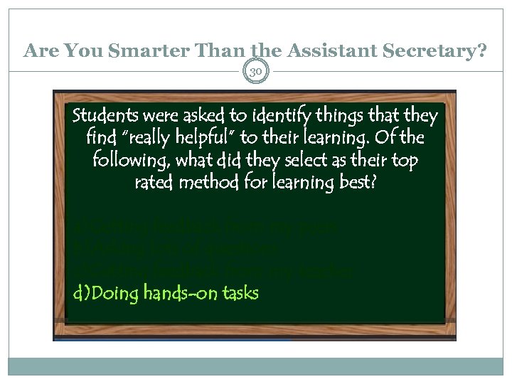 Are You Smarter Than the Assistant Secretary? 30 Students were asked to identify things that they find “really helpful” to their learning. Of the following, what did they select as their top rated method for learning best? a)Getting feedback from my peers b)Asking lots of questions c)Getting feedback from my teacher d)Doing hands-on tasks