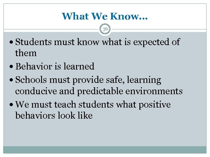 What We Know… 36 Students must know what is expected of them Behavior is learned Schools must provide safe, learning conducive and predictable environments We must teach students what positive behaviors look like