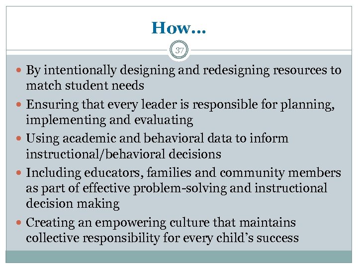 How… 37 By intentionally designing and redesigning resources to match student needs Ensuring that every leader is responsible for planning, implementing and evaluating Using academic and behavioral data to inform instructional/behavioral decisions Including educators, families and community members as part of effective problem-solving and instructional decision making Creating an empowering culture that maintains collective responsibility for every child’s success