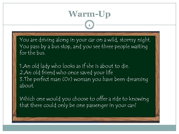 Warm-Up 4 You are driving along in your car on a wild, stormy night. You pass by a bus stop, and you see three people waiting for the bus. 1. An old lady who looks as if she is about to die. 2. An old friend who once saved your life 3. The perfect man (0 r) woman you have been dreaming about. Which one would you choose to offer a ride to knowing that there could only be one passenger in your car?