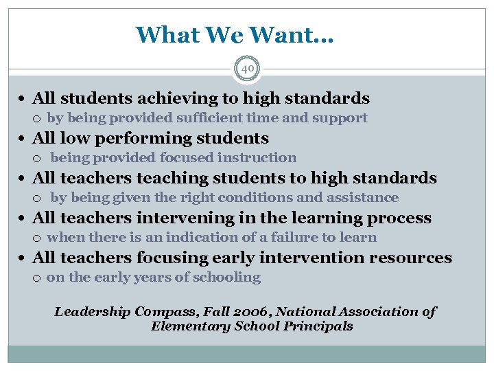 What We Want… 40 All students achieving to high standards by being provided sufficient time and support All low performing students being provided focused instruction All teachers teaching students to high standards by being given the right conditions and assistance All teachers intervening in the learning process when there is an indication of a failure to learn All teachers focusing early intervention resources on the early years of schooling Leadership Compass, Fall 2006, National Association of Elementary School Principals