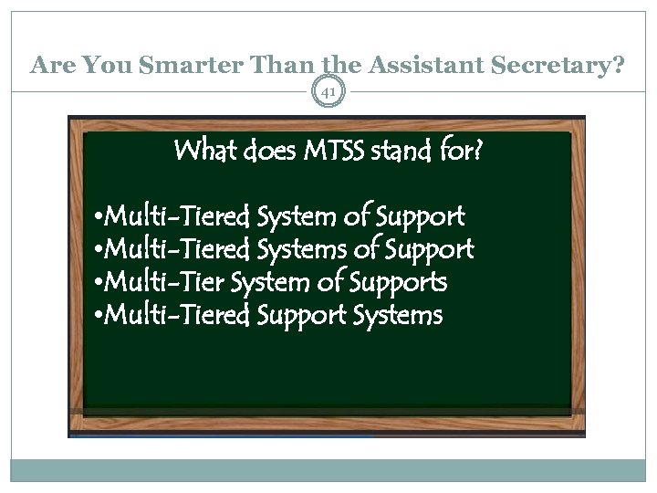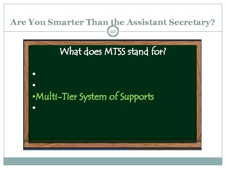 Are You Smarter Than the Assistant Secretary? 41 What does MTSS stand for? • Multi-Tiered System of Support • Multi-Tiered Systems of Support • Multi-Tier System of Supports • Multi-Tiered Support Systems