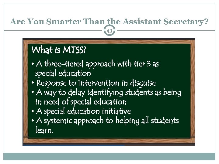 Are You Smarter Than the Assistant Secretary? 42 What does MTSS stand for? • • • Multi-Tier System of Supports •