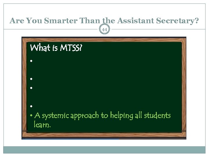 Are You Smarter Than the Assistant Secretary? 43 What is MTSS? • A three-tiered approach with tier 3 as special education • Response to Intervention in disguise • A way to delay identifying students as being in need of special education • A special education initiative • A systemic approach to helping all students learn.