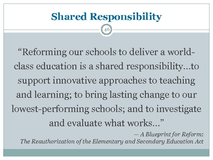 Shared Responsibility 46 “Reforming our schools to deliver a worldclass education is a shared responsibility…to support innovative approaches to teaching and learning; to bring lasting change to our lowest-performing schools; and to investigate and evaluate what works…” — A Blueprint for Reform: The Reauthorization of the Elementary and Secondary Education Act