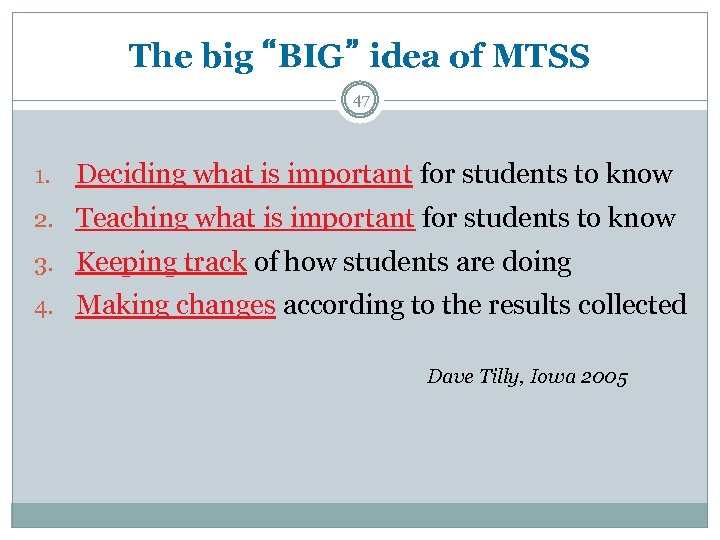 The big “BIG” idea of MTSS 47 1. Deciding what is important for students to know 2. Teaching what is important for students to know 3. Keeping track of how students are doing 4. Making changes according to the results collected Dave Tilly, Iowa 2005