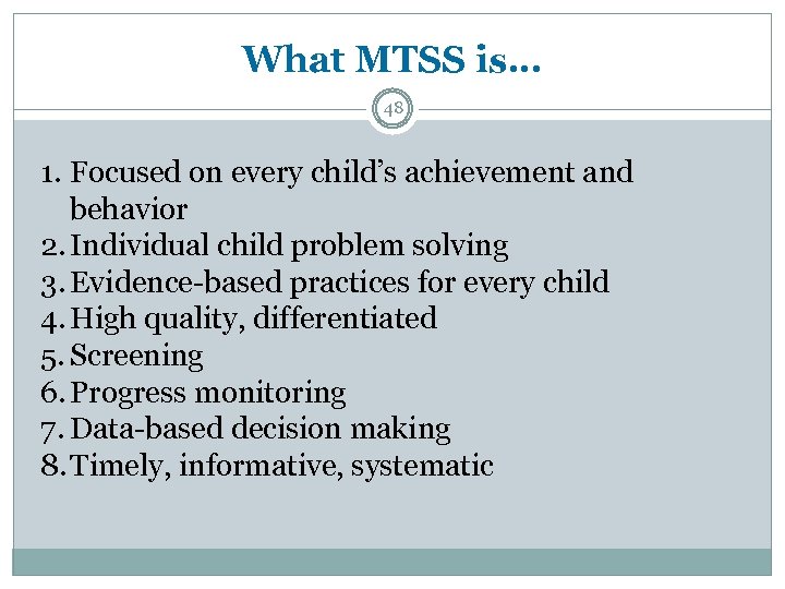 What MTSS is… 48 1. Focused on every child’s achievement and behavior 2. Individual child problem solving 3. Evidence-based practices for every child 4. High quality, differentiated 5. Screening 6. Progress monitoring 7. Data-based decision making 8. Timely, informative, systematic