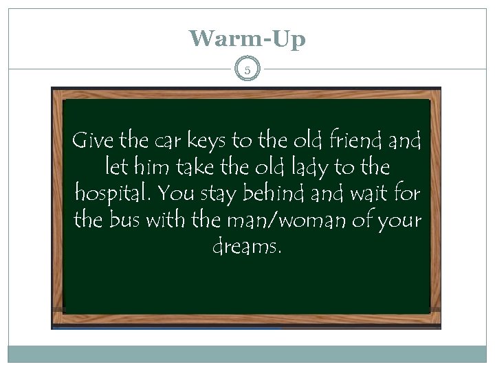 Warm-Up 5 Give the car keys to the old friend and let him take the old lady to the hospital. You stay behind and wait for the bus with the man/woman of your dreams.