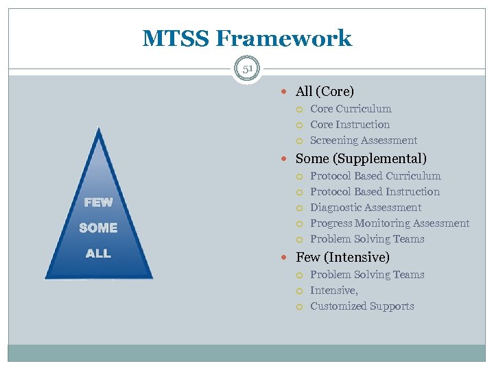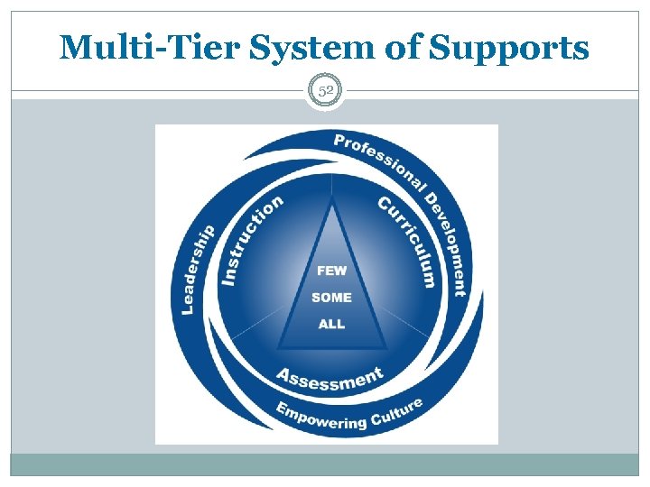 MTSS Framework 51 All (Core) Core Curriculum Core Instruction Screening Assessment Some (Supplemental) Protocol Based Curriculum Protocol Based Instruction Diagnostic Assessment Progress Monitoring Assessment Problem Solving Teams Few (Intensive) Problem Solving Teams Intensive, Customized Supports