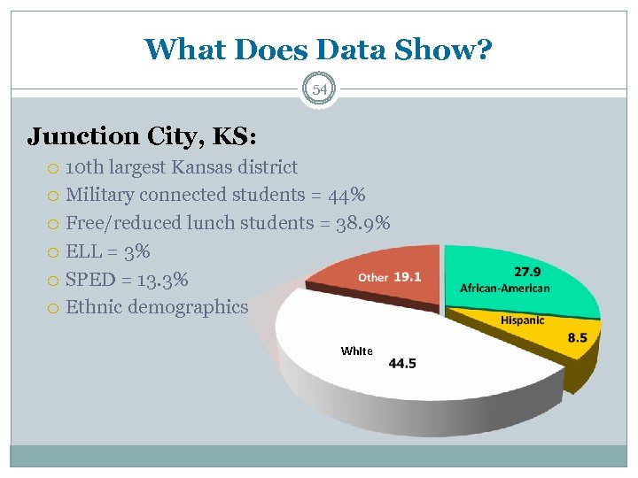 What Does Data Show? 54 Junction City, KS: 10 th largest Kansas district Military connected students = 44% Free/reduced lunch students = 38. 9% ELL = 3% SPED = 13. 3% Ethnic demographics White