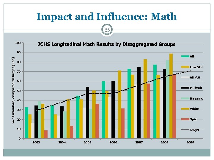 Impact and Influence: Math 55 100 JCHS Longitudinal Math Results by Disaggregated Groups % at standard, compared to target (line) 90 All 80 Low SES 70 Afr-AM 60 Multcult 50 Hispanic 40 30 White 20 Sped 10 Target 0 2003 2004 2005 2006 2007 2008 2009