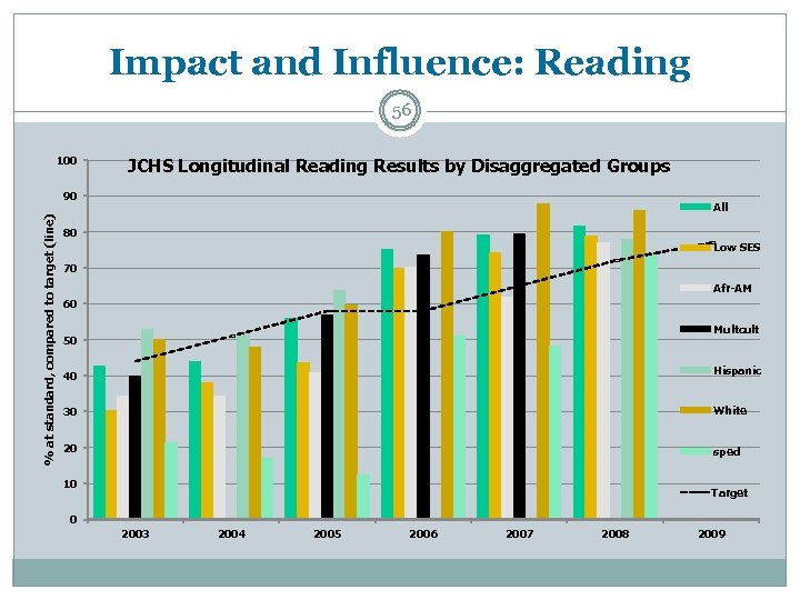 Impact and Influence: Reading 56 100 JCHS Longitudinal Reading Results by Disaggregated Groups % at standard, compared to target (line) 90 All 80 Low SES 70 Afr-AM 60 Multcult 50 Hispanic 40 30 White 20 sped 10 Target 0 2003 2004 2005 2006 2007 2008 2009