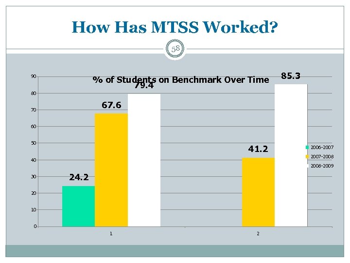 How Has MTSS Worked? 58 90 % of Students on Benchmark Over Time 79. 4 85. 3 80 67. 6 70 60 50 41. 2 40 30 2006 -2007 -2008 -2009 24. 2 20 10 0 1 2