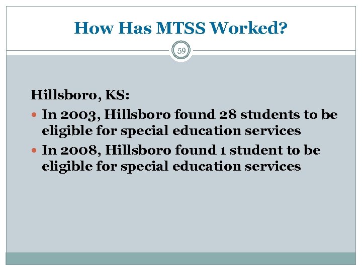 How Has MTSS Worked? 59 Hillsboro, KS: In 2003, Hillsboro found 28 students to be eligible for special education services In 2008, Hillsboro found 1 student to be eligible for special education services