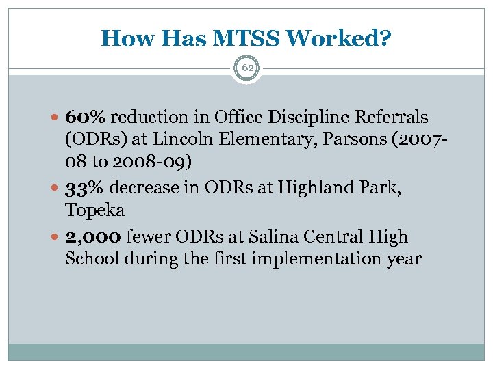 How Has MTSS Worked? 62 60% reduction in Office Discipline Referrals (ODRs) at Lincoln Elementary, Parsons (200708 to 2008 -09) 33% decrease in ODRs at Highland Park, Topeka 2, 000 fewer ODRs at Salina Central High School during the first implementation year
