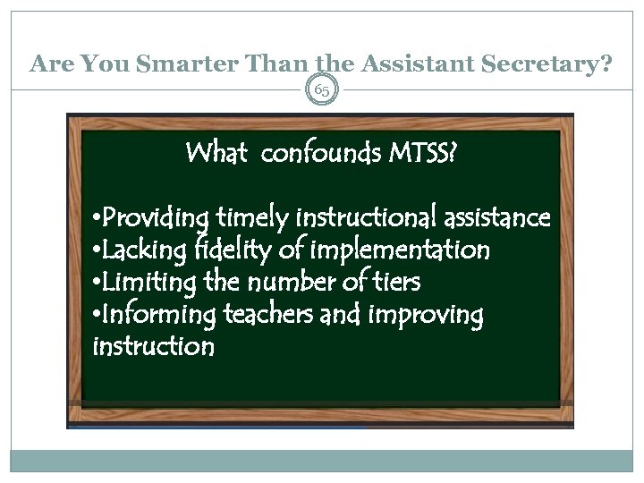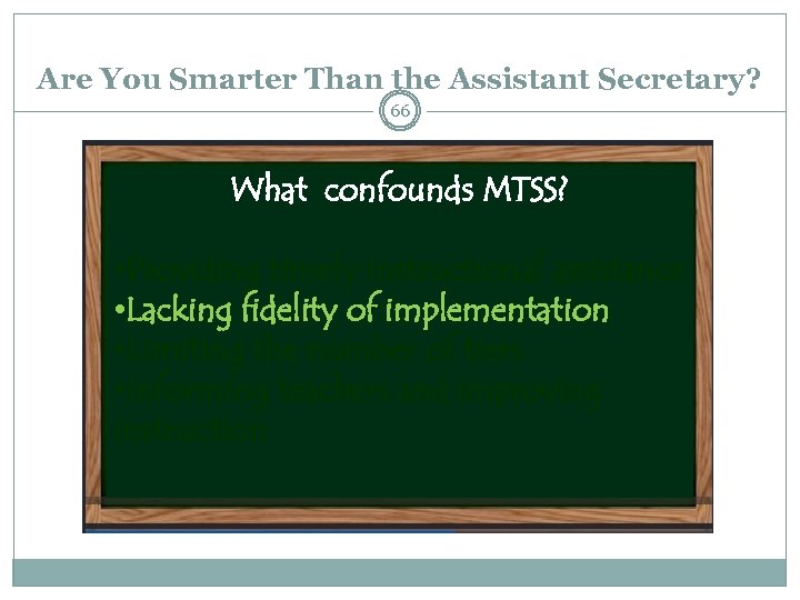 Are You Smarter Than the Assistant Secretary? 65 What confounds MTSS? • Providing timely instructional assistance • Lacking fidelity of implementation • Limiting the number of tiers • Informing teachers and improving instruction