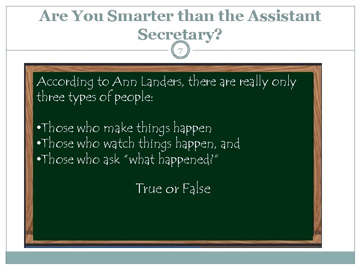 Are You Smarter than the Assistant Secretary? 8 According to Ann Landers, there are really only three types of people: • Those who make things happen • Those who watch things happen, and • Those who ask “what happened? ” True or False