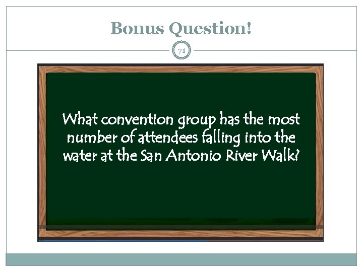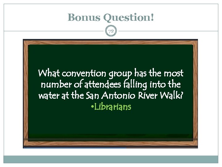 Bonus Question! 72 What convention group has the most number of attendees falling into the water at the San Antonio River Walk? • Librarians