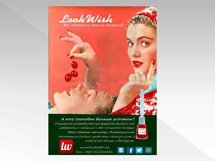 Название/Продукт Look wish –лаки для ногтей Дата составления 14. 05. 16 Формат Press ad (реклама в печатном издании) Общая информация Работа над проектом стартовала с маркетингового исследования рынка стойких лаков не требующих LED/UV ламп. Основной вывод исследования, что 90% конкурентных торговых марок используют изображения готового продукта, как центральный элемент дизайна рекламы. Исходя из необходимости отстроиться от конкурентов, было принято решение искать позиционирование в эмоциональном образе.