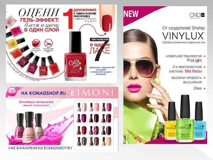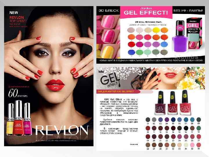 Вербальные компоненты Слоган : «Все оттенки твоих желаний» Заголовок: «А кто способен дольше устоять? » ОРТ: Специально разработанная формула делает лак невероятно стойким и обеспечивает гелевый блеск твоему маникюру. инновационная технология делает цвет лака насыщенным, а нанесение легким и быстрым.