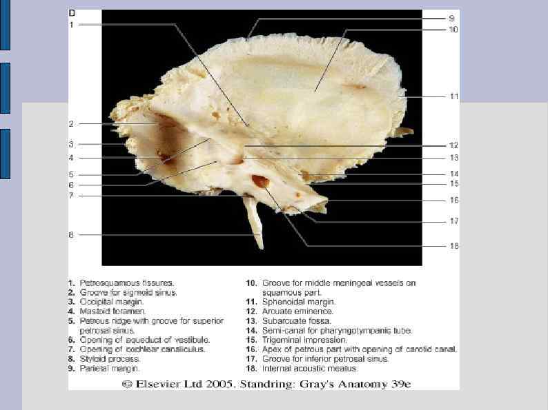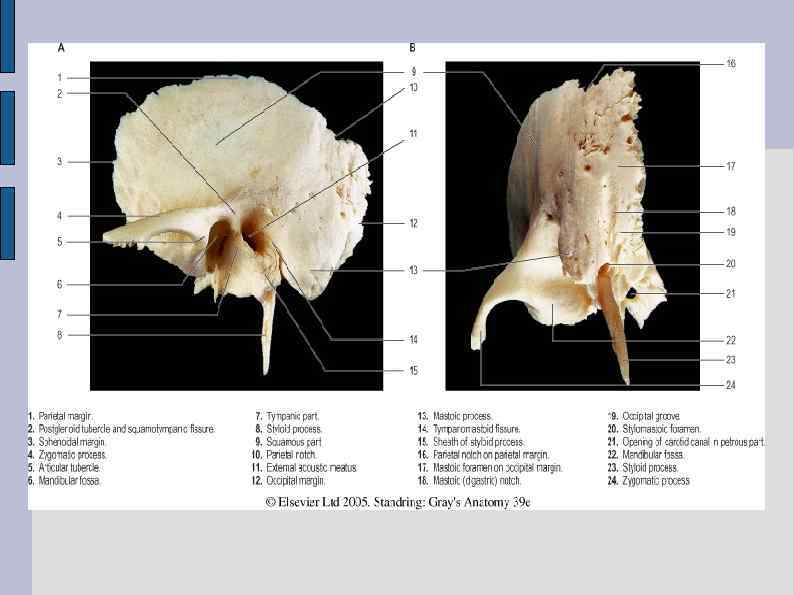 Связь с костями черепа ОСС: - sutura occipitomastoidea - sutura petrojugularis - sutura petrobasilaris SPH: - sutura sphenopetrosa - sutura sphenosquamosa PSS PAR: - sutura squamoparietale (squamosa) - sutura parietomastoidea ZYG: sutura temporozygomatica ВНЧС: с caput mandibulae