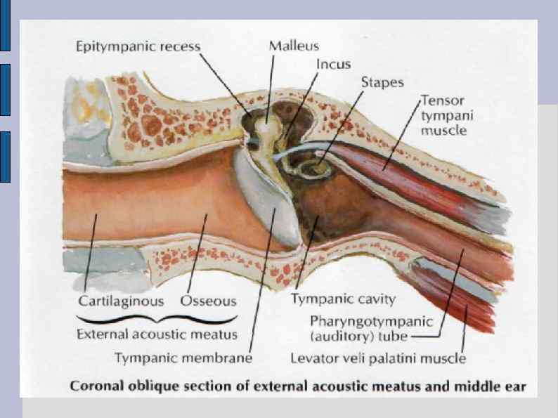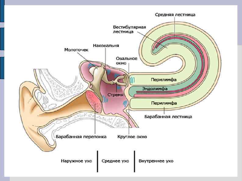 Орган слуха Наружное ухо: ушная раковина, наружный слуховой проход Среднее ухо: барабанная полость слуховая труба Внутреннее ухо: костный и перепончатый лабиринты (преддверие, полукружные каналы, улитка)