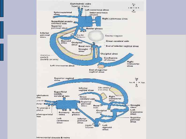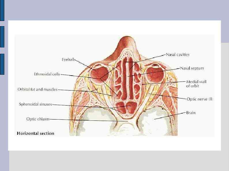 Отверстия, каналы и щели орбиты foramen ethmoidale anterius – ETHM / FR: - n. ethmoidalis anterior <– n. nasociliaris <– n. ophthalmicus (CN V 1), - a. ethmoidalis anterior <– a. ophthalmica < – a. carotis interna. NB! Связь орбита – передняя черепная ямка. foramen ethmoidale posterius – ETHM / FR: - n. ethmoidalis posterior<– n. nasociliaris <– n. ophthalmicus (CN V 1), - a. ethmoidalis posterior <– a. ophthalmica <– a. carotis interna. NB! Связь орбита – задние ячейки ETHM.