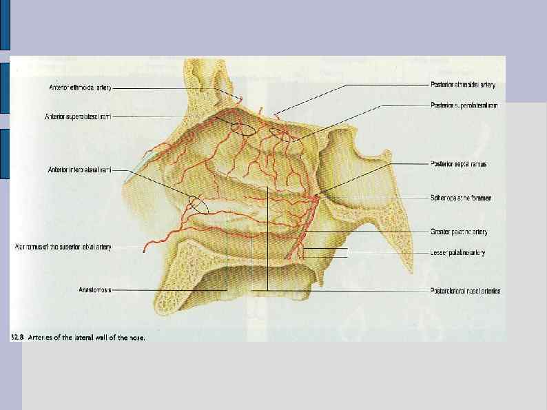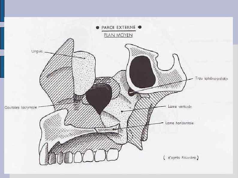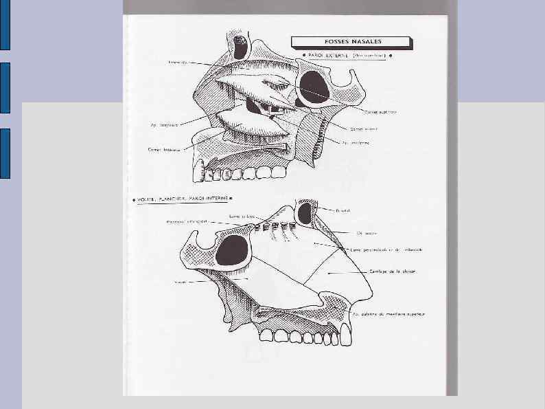 Полость носа имеет 4 стенки: - наружная - верхняя челюсть, слезная кость, перпендикулярная пластина небной кости, крылонебный отросток OS, латеральные массы OE, нижняя носовая раковина; - внутренняя — перпендикулярная пластина OE, сошник, хрящ; - верхняя — носовая ость OF, продырявленная пластина OE, тело OS; - нижняя — небный отросток maxilla, горизонтальная пластина OP