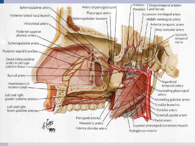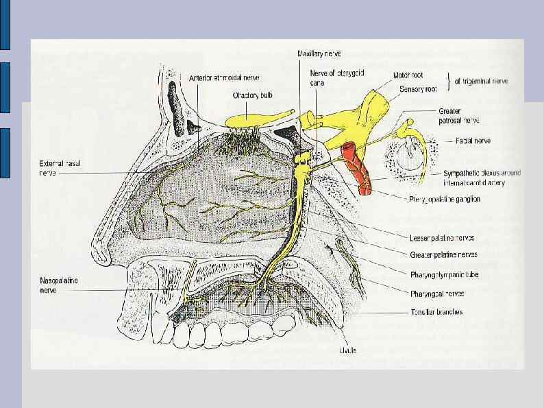 Отверстия, каналы и щели орбиты sulcus/canalis infraorbitalis – MAX: - n. infraorbitalis <– n. maxillaris (CN V 2), - a. infraorbitalis <– a. maxillaris<– a. carotis externa. NB! fossa pterygopalatina foramen zygomaticoorbitale – canalis: - foramen zygomaticofaciale: r. zygomaticofacialis<– n. zygomaticus <– n. maxillaris (CN V 2), - foramen zygomaticotemporale: r. zygomaticotemporalis<– n. zygomaticus <– n. maxillaris (CN V 2).