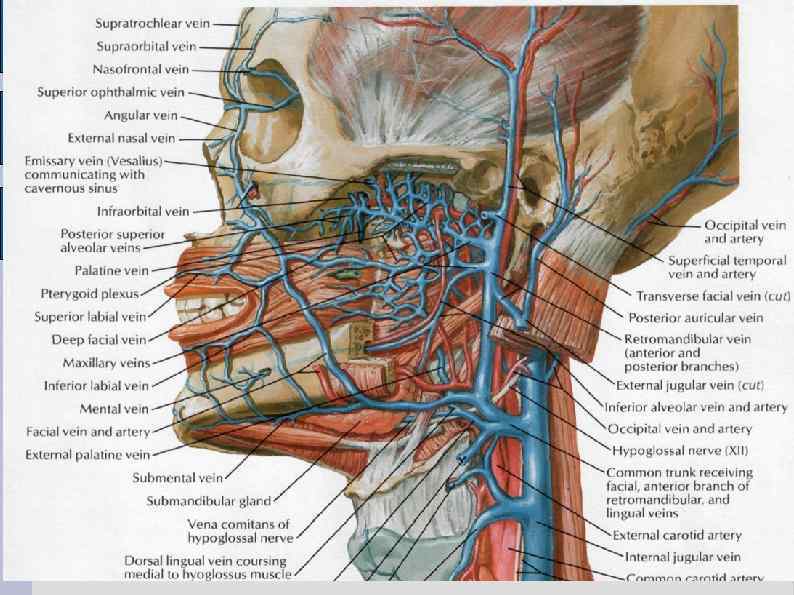 Отверстия, каналы и щели орбиты incisura supraorbitalis – margo supraorbitalis FR (латерально): - r. lateralis n. supraorbitalis <– n. ophthalmicus (CN V 1), - а. supraorbitalis <– a. ophthalmica <– a. carotis interna, - v. supraorbitalis. incisura frontalis – margo supraorbitalis FR (медиально): - r. medialis n. supraorbitalis <– n. ophthalmicus (CN V 1), - a. supratrochlearis <– a. ophthalmica <–a. carotis interna - v. supratrochlearis.