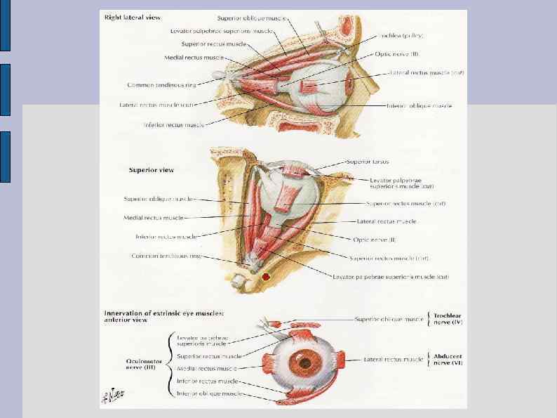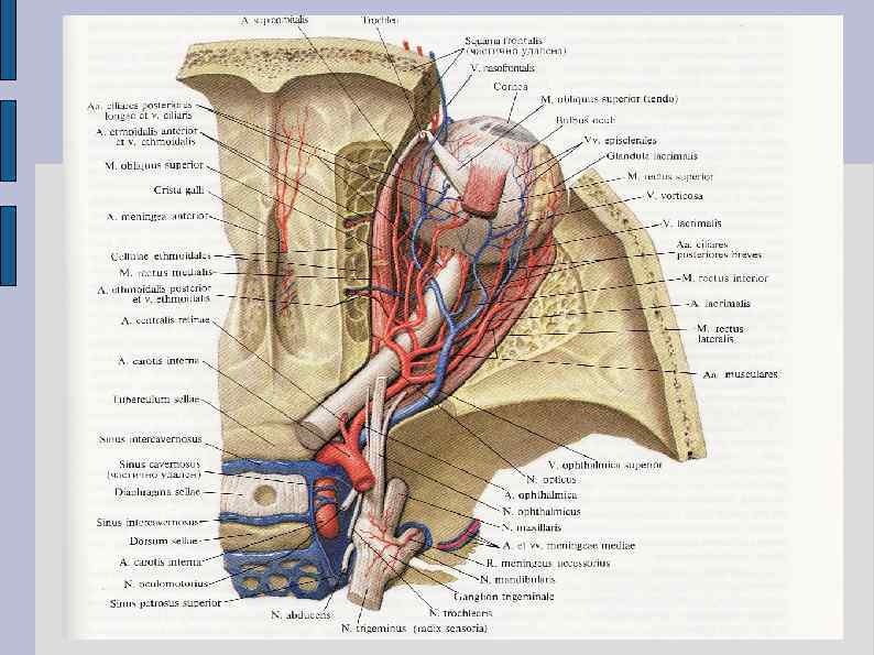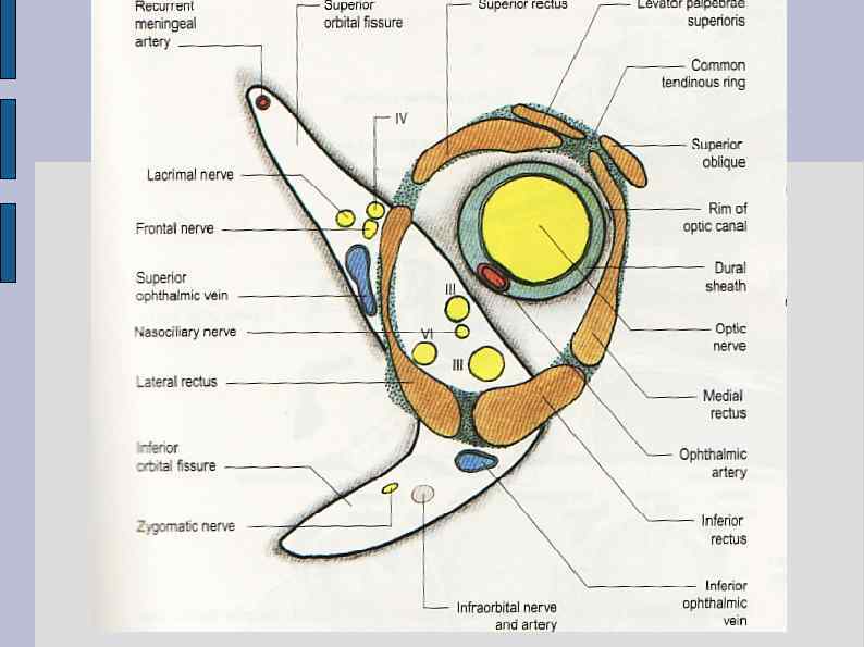 Отверстия, каналы и щели орбиты canalis opticus – в ala minor SPH: - n. opticus (CN II), - a. ophthalmica <– a. carotis interna. NB! Связь орбита – средняя черепная ямка. fissura orbitalis superior – между ala minor и ala major SPH: - n. oculomotorius (CN III), - n. trochlearis (CN IV), - n. lacrimalis – n. ophthalmicus (CN V 1), - n. frontalis – n. ophthalmicus (CN V 1), - n. nasociliaris – n. ophthalmicus (CN V 1), - n. abducens (CN VI) - v. ophthalmica superior –> sinus cavernosus. NB! Связь орбита – средняя черепная ямка.