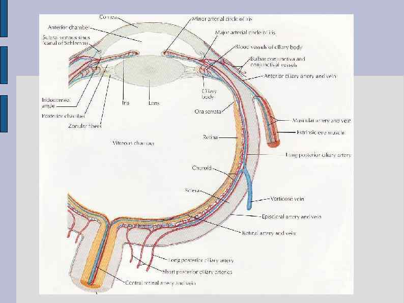 3 оболочки глазного яблока: наружная – tunica fibrosa bulbi: - роговица - склера cредняя – tunica vasculosa bulbi: - собственно сосудистая, - ресничное тело, - радужка внутренняя – tunica sensoria bulbi (сетчатка)