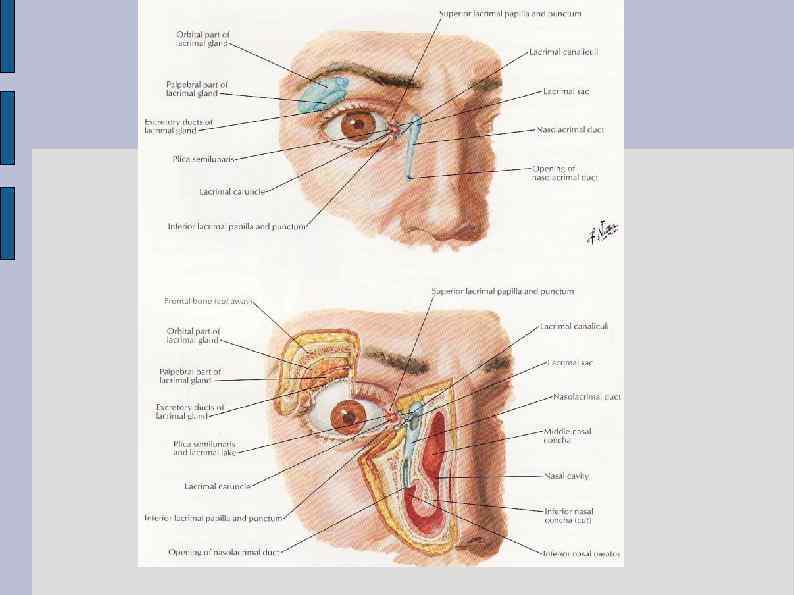 Отверстия, каналы и щели орбиты fissura orbitalis inferior – между MAX и ala major SPH: - n. zygomaticus <– n. maxillaris (CN V 2), -n. infraorbitalis <– n. maxillaris (CN V 2), - v. ophthalmica inferior <–plexus pterygoideus. NB! Связь орбита – fossa pterygopalatina и fossa infratemporalis. sulcus lacrimalis –> fossa sacci lacrimalis –> canalis nasolacrimalis. NB! Связь орбита – нижний носовой ход.