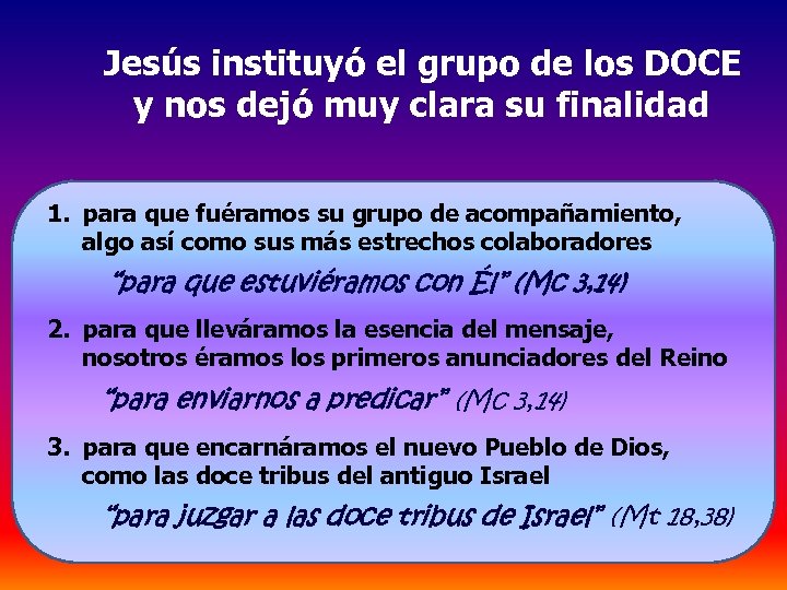 Jesús instituyó el grupo de los DOCE y nos dejó muy clara su finalidad 1. para que fuéramos su grupo de acompañamiento, algo así como sus más estrechos colaboradores “para que estuviéramos con Él” (Mc 3, 14) 2. para que lleváramos la esencia del mensaje, nosotros éramos los primeros anunciadores del Reino “para enviarnos a predicar” (Mc 3, 14) 3. para que encarnáramos el nuevo Pueblo de Dios, como las doce tribus del antiguo Israel “para juzgar a las doce tribus de Israel” (Mt 18, 38)
