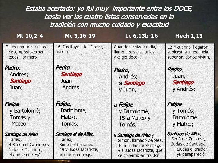 Estaba acertado: yo fui muy importante entre los DOCE, basta ver las cuatro listas conservadas en la tradición con mucho cuidado y exactitud Mt 10, 2 -4 Mc 3, 16 -19 Lc 6, 13 b-16 Hech 1, 13 16 Instituyó a los Doce y puso a Cuando se hizo de día, llamó a sus discípulos, y eligió doce… 13 Y cuando llegaron subieron a la estancia superior, donde vivían, Felipe, 2 Los nombres de los doce Apóstoles son éstos: primero a Felipe y Bartolomé, 15 a Mateo y Tomás, Felipe todas listas se componen de tres grupos con 4 nombres los nombres de cada grupo son siempre los mismos Pedro, puede variar el. Santiago dentro del grupo, pero no el grupo puesto Andrés; Juan, Andrés; Santiago el mismo apóstol encabeza siempre Santiago grupo Santiago Juan a el mismo Andrés y Andrés; y Juan, Juan; PEDRO, por su primado, ocupa siempre el primer lugar JUDAS, por su traición, ocupa siempre el último lugar Felipe Bartolomé, Mateo, Tomás, y Bartolomé; Tomás y Mateo SE NOTA MI de Alfeo, IMPORTANCIAAlfeo y Santiago el a Santiago de Alfeo y Tomás; Bartolomé y Mateo; Santiago de Alfeo, Simón Tadeo, llamado Zelotes; yo estoy. Cananeo situado en. Simón, primer grupo de Zelotes y el. Judas de Santiago, Judas el Santiago. Simón el 16 a (Judas el traidor 19 ysegundo Judas Iscariote, y a Judas Iscariote, que en elque le entregó. o tercer puesto ya desapareció) el se convirtió en traidor. Tadeo; 4 Simón el Cananeo y Judas el Iscariote, el que le entregó.