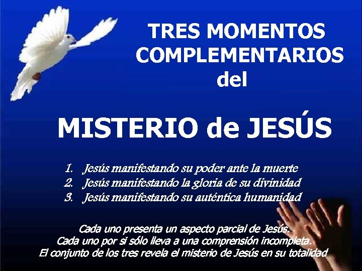 TRES MOMENTOS DE REVELACIÓN COMPLEMENTARIOS 1º. TALITA: el misterio del Reino del MISTERIO de JESÚS 2º. TABOR: el misterio de Jesús 1. Jesús manifestando su poder ante la muerte 2. Jesús manifestando la gloria de su divinidad 3. Jesús manifestando su auténtica humanidad 3º. GETSEMANÍ: el misterio del Cada uno presenta un aspecto parcial de Jesús. Dios sufriente Cada uno por si sólo lleva a una comprensión incompleta. El conjunto de los tres revela el misterio de Jesús en su totalidad