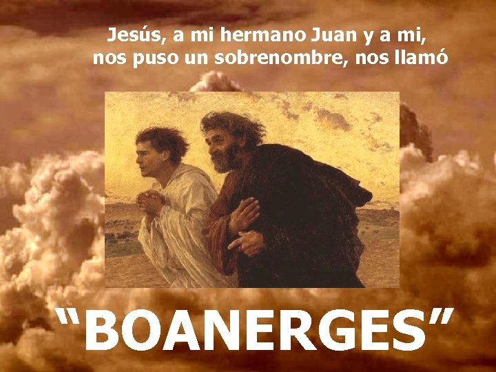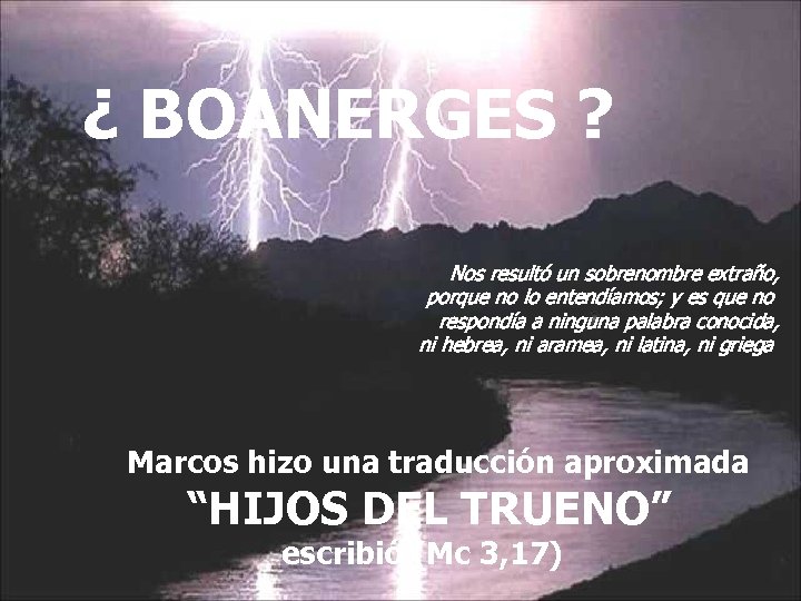 ¿ BOANERGES ? Nos resultó un sobrenombre extraño, porque no lo entendíamos; y es que no respondía a ninguna palabra conocida, ni hebrea, ni aramea, ni latina, ni griega Marcos hizo una traducción aproximada “HIJOS DEL TRUENO” escribió (Mc 3, 17)