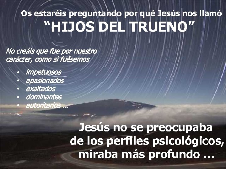 Os estaréis preguntando por qué Jesús nos llamó “HIJOS DEL TRUENO” No creáis que fue por nuestro carácter, como si fuésemos • • • impetuosos apasionados exaltados dominantes autoritarios … Jesús no se preocupaba de los perfiles psicológicos, miraba más profundo …