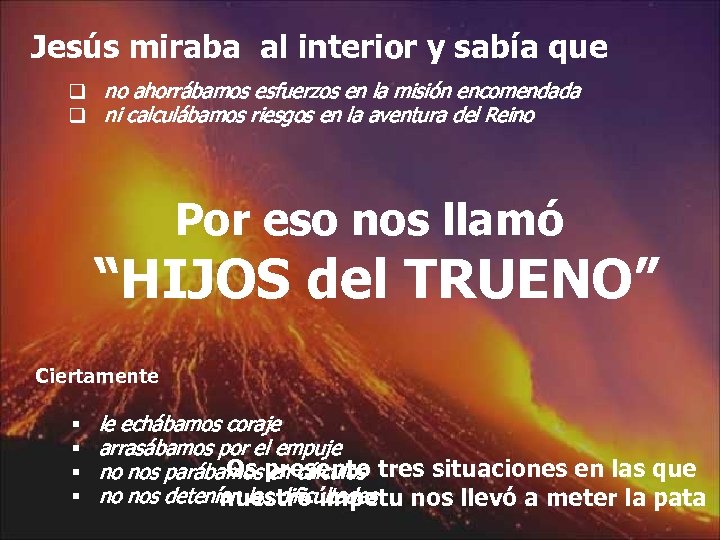 Jesús miraba al interior y sabía que q no ahorrábamos esfuerzos en la misión encomendada q ni calculábamos riesgos en la aventura del Reino Por eso nos llamó “HIJOS del TRUENO” Ciertamente § § le echábamos coraje arrasábamos por el empuje Os en cálculos no nos parábamos presento tres situaciones en las que no nos detenían las dificultades nuestro ímpetu nos llevó a meter la pata