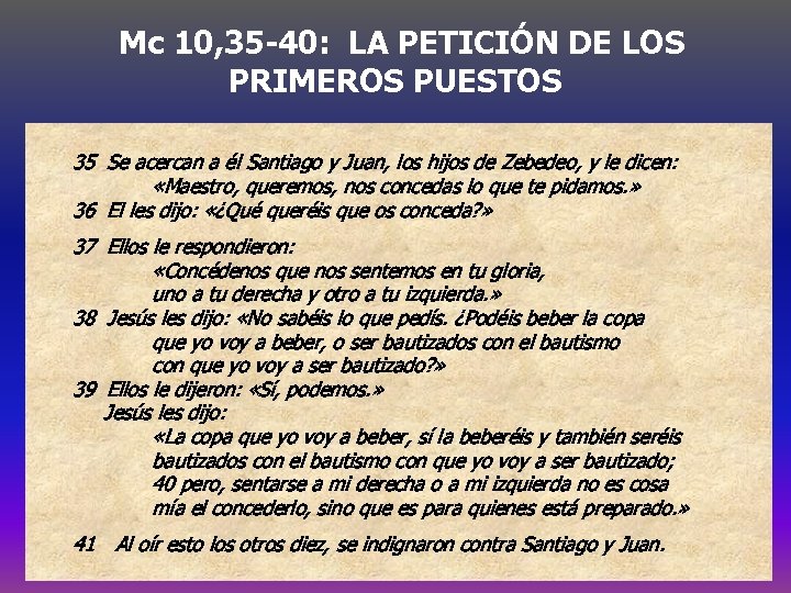 Mc 10, 35 -40: LA PETICIÓN DE LOS PRIMEROS PUESTOS 35 Se acercan a él Santiago y Juan, los hijos de Zebedeo, y le dicen: «Maestro, mayor nos concedas lo que te pidamos. » La queremos, metedura de pata 36 El les dijo: «¿Qué queréis que os conceda? » fue nuestra ambición de 37 Ellos le respondieron: obtener los primeros puestos «Concédenos que nos sentemos en tu gloria, uno a tu derecha y otro a tu izquierda. » 38 Jesús les dijo: «No sabéis lo que pedís. ¿Podéis beber la copa Me a beber, o ser bautizados con el bautismo que yo voyda vergüenza recordarlo: con que yo voy a ser bautizado? » no habíamos entendido nada 39 Ellos le dijeron: «Sí, podemos. » Jesús les dijo: del proyecto de Jesús «La copa que yo voy a beber, sí la beberéis y también seréis bautizados con el bautismo con que yo voy a ser bautizado; 40 pero, sentarse a mi derecha o a mi izquierda no es cosa mía el concederlo, sino que es para quienes está preparado. » 41 Al oír esto los otros diez, se indignaron contra Santiago y Juan.