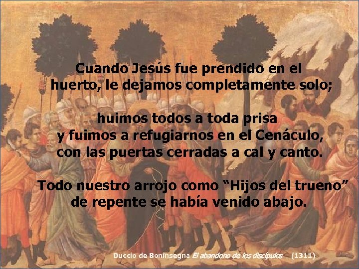 Cuando Jesús fue prendido en el huerto, le dejamos completamente solo; huimos todos a toda prisa y fuimos a refugiarnos en el Cenáculo, con las puertas cerradas a cal y canto. Todo nuestro arrojo como “Hijos del trueno” de repente se había venido abajo. Duccio de Boninsegna El abandono de los discípulos (1311)