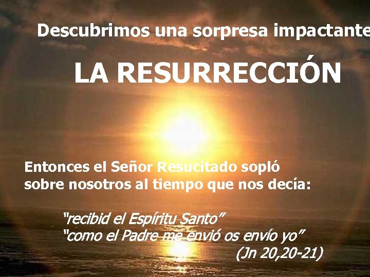 Descubrimos una sorpresa impactante LA RESURRECCIÓN Y entonces todo cambió… Entonces el Señor Resucitado sopló sobre nosotros al tiempo que nos decía: “recibid el Espíritu Santo” “como el Padre me envió os envío yo” (Jn 20, 20 -21)