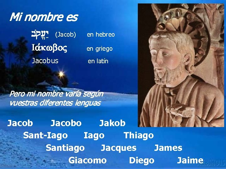 Mi nombre es bq{[y: (Jacob) en hebreo Ia, , kwbo en griego Jacobus en latín Pero mi nombre varía según vuestras diferentes lenguas Jacobo Jakob Sant-Iago Thiago Santiago Jacques James Giacomo Diego Jaime