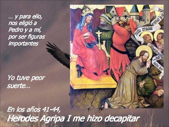 … y para ello, nos eligió a Pedro y a mí, por ser figuras importantes Yo tuve peor suerte… En los años 41 -44, Herodes Agripa I me hizo decapitar